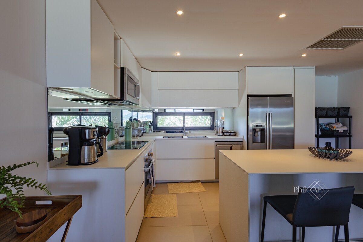 3 Quartos enormes com vista para dias, irá ajudá-lo a deixar as suas preocupações neste espaço espaçoso e sereno. Localizada mesmo na praia, esta cobertura com um terraço não só lhe dá vista para Simpson Bay, mas também de Maho Beach, permitindo-lhe ver os aviões entrarem. Além disso, esta cobertura fica mesmo na praia e, literalmente, a poucos passos da areia. As comodidades incluem uma piscina infinita, Wi-Fi rápido, TV Sony OLED, sistema de som de teatro, mobiliário de exterior moderno, estacionamento dedicado e vpn