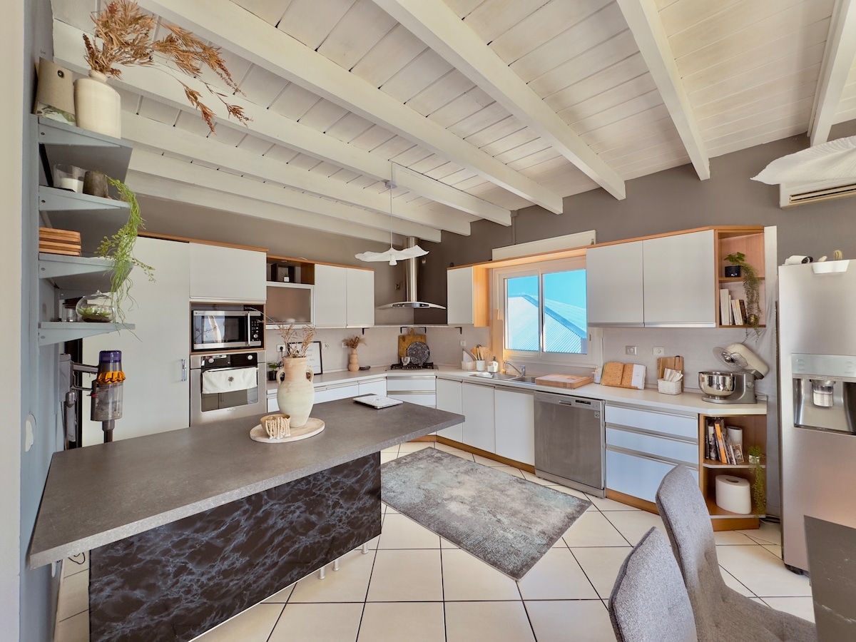 Esqueça as suas preocupações em Kastanéa. A nossa moradia localizada num parque de 5000 M2 está totalmente equipada para o seu conforto (a piscina é aquecida) e para o seu lazer (ténis de mesa, ténis de praia, etc.). Também está idealmente localizado para descobrir a ilha de Réunion enquanto está perto de lojas e restaurantes. Os cinco quartos são fornecidos com as suas próprias instalações sanitárias e os lençóis são fornecidos (toalhas opcionais) Para as suas refeições, um grande terraço com uma bela vista espera por si.
