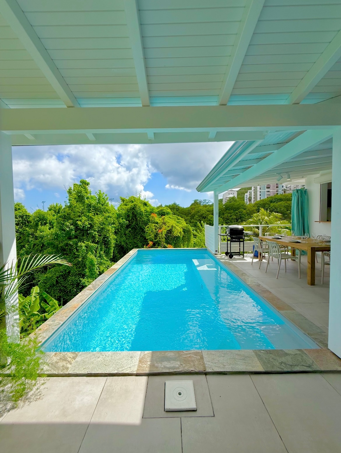 Bela moradia, localizada nas alturas de Sainte Luce, e perto da praia Inclui 2 quartos com ar condicionado (camas de casal) + vestiários + 2 casas de banho, piscina privada (protegida por alarme e portão) Vistas panorâmicas de 180 graus do Mar das Caraíbas e do jardim. Situado no coração da natureza, desfrutará do canto dos pássaros e do jardim. Não negligenciado. A 5 minutos da praia e de comodidades (Carrefour Express, farmácia, restaurante). Capacidade: 4 pessoas + 1 bebé