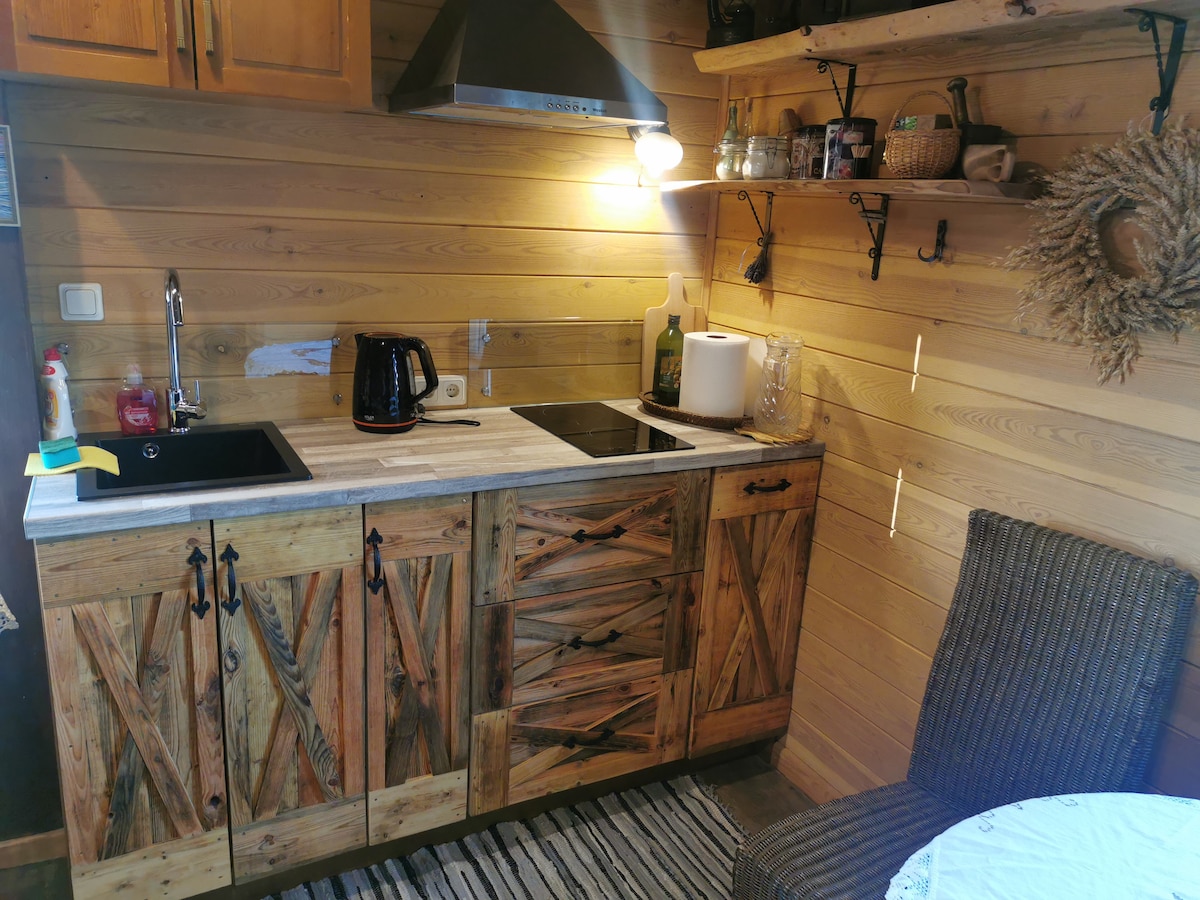 Nice local tranquilo perto da natureza tranquila. À sua disposição, há uma cabana bem equipada para 2 pessoas com a possibilidade de ficar 4 pessoas e um terraço com ótima vista. Oito minutos a pé da bela costa da baía marítima de Riga, onde pode desfrutar do nascer e do pôr do sol. A praia é tranquila e sem pedras, o que é importante para os nadadores.