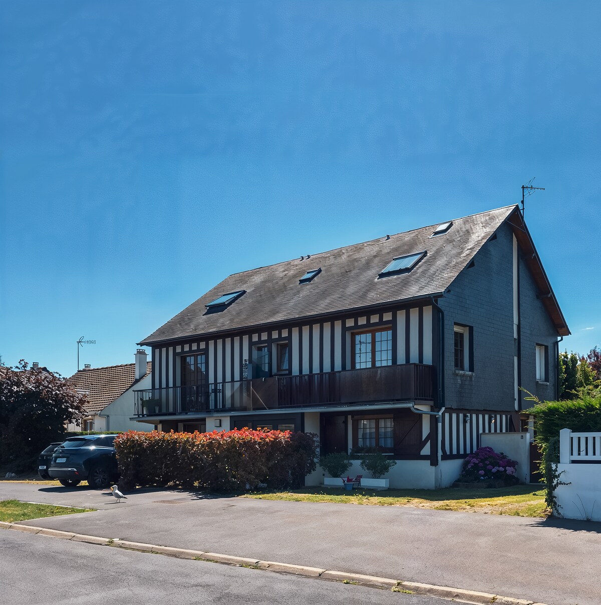 Em 3 andares, a casa oferece uma sala de estar/cozinha no térreo, banheiro e área de estar no 1º andar, o quarto no 2º andar. Ela está localizada a 600 metros da avenida do mar, de suas lojas e restaurantes, dando acesso à praia e suas animações (cassino, mini-golfe, karting, centro equestre, etc.). Perto da acomodação estão lojas e serviços: cinema, padarias, açougues, quitandas, queijaria, chocolateria, pizzaria. Ponto de partida ideal para visitar os locais do desembarque.