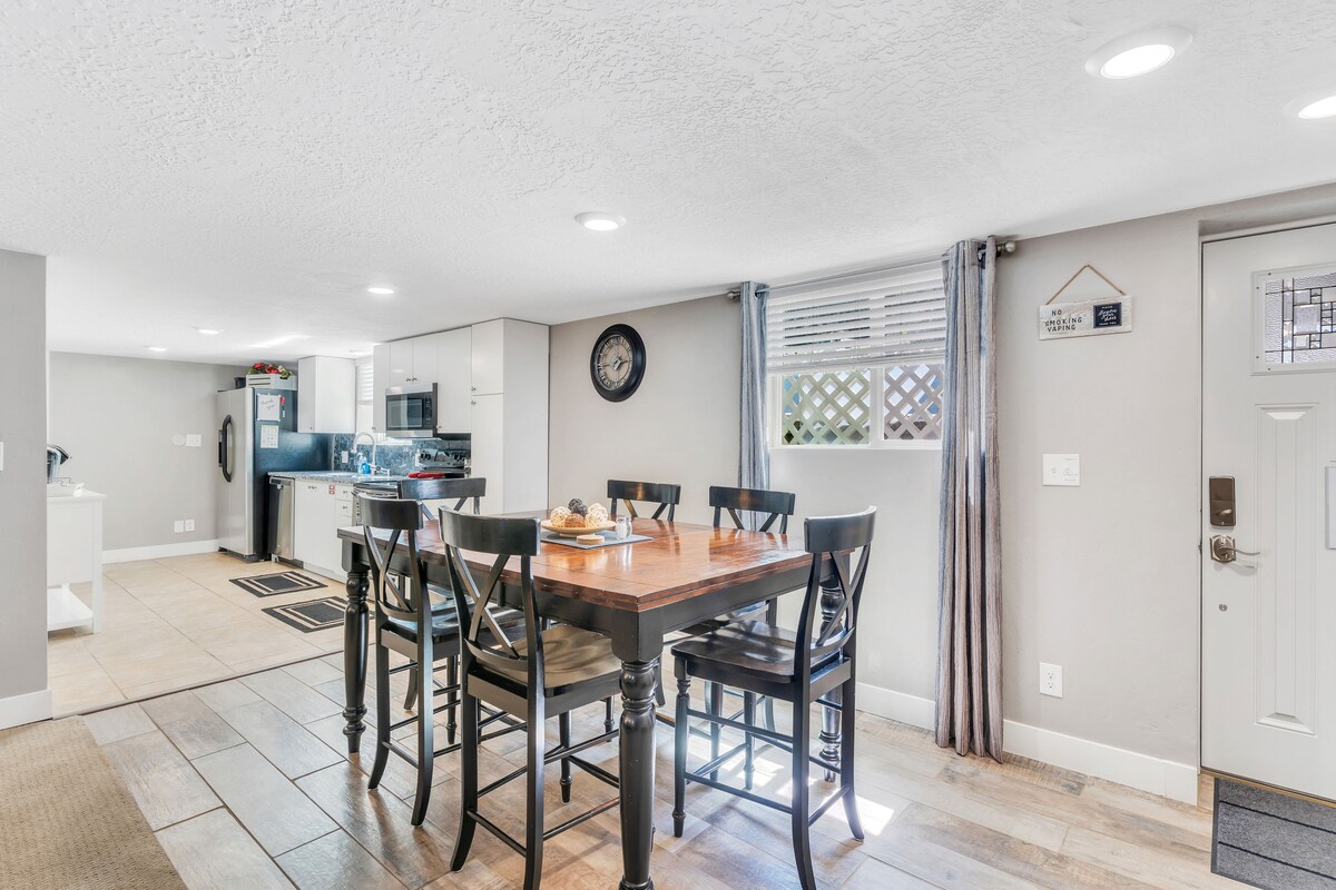 Uma entrada privativa convidará você para sua própria suíte de dois quartos no porão. SEM TAXAS DE LIMPEZA ***Você deve concordar com nosso AVISO DE ALERGIA para reservar*** Caia em um sono profundo com camas tamanho queen e móveis mais novos em todos os lugares. A aconchegante sala de estar é ótima para se espalhar e relaxar. Cozinha completa e área de jantar. Desfrute de água quente ilimitada. Filmes e programas intermináveis estão ao seu alcance, juntamente com Wi-Fi de alta velocidade. Há muito espaço para relaxar após um longo dia de viagem e diversão.