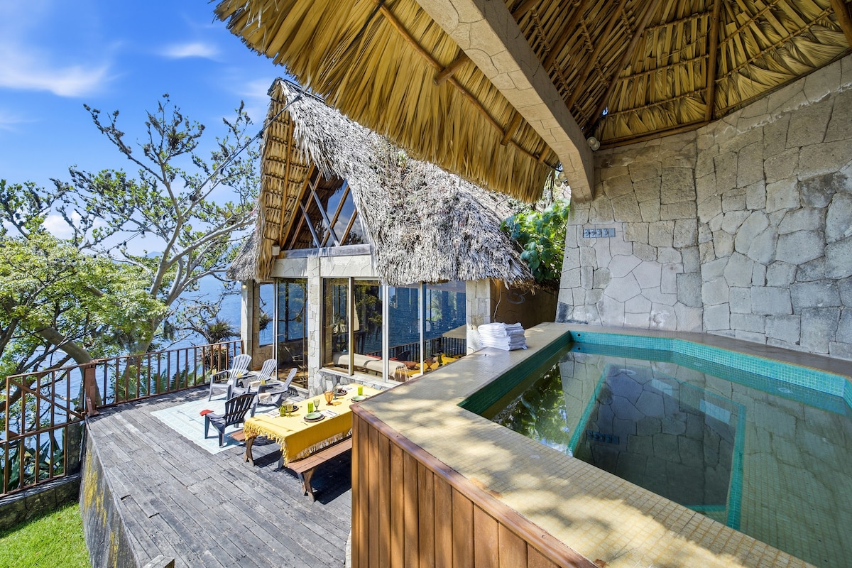 Luxo rústico + beleza natural deslumbrante. Plantas tropicais e árvores de fruto rodeiam esta moradia verdadeiramente única com vista para uma enseada com piscina privada, onde falésias com 21 metros mergulham em águas cristalinas e emolduram vistas espetaculares para o vulcão. Vá à sauna, reme os SUPs/caiaques, mergulhe na banheira exterior ou faça um piquenique com uma pizza no forno de tijolos. Há muitos espaços exteriores para apanhar sol, relaxar, fazer refeições ao ar livre e apreciar as vistas extraordinárias. Desfrute do Lago Atitlán no seu melhor. Chef privado disponível.