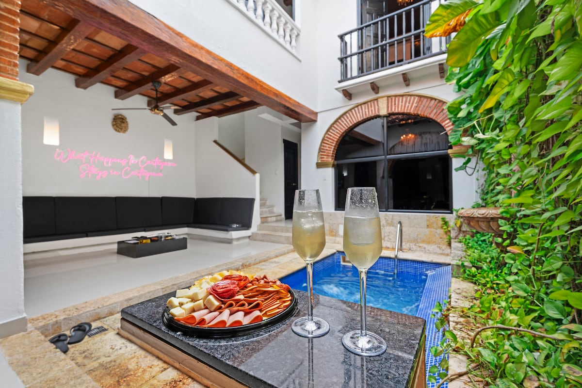 Magnífica casa do século XVIII recentemente restaurada por um dos designers mais renomados da Colômbia. A vila de 4 andares com 4200 pés quadrados inclui 5 quartos, 2 salas de estar, um mirante de 360° e uma das melhores piscinas no terraço do centro histórico. Desfruta de uma localização privilegiada situada a 2 quarteirões do Pegasus Marina, do Media Luna Plaza, do Centro de Convenções e do New Four Seasons Hotel em Getsemani. Inclui: café da manhã americano diário, empregada doméstica, chef e porteiro (das 18h às 6h).
