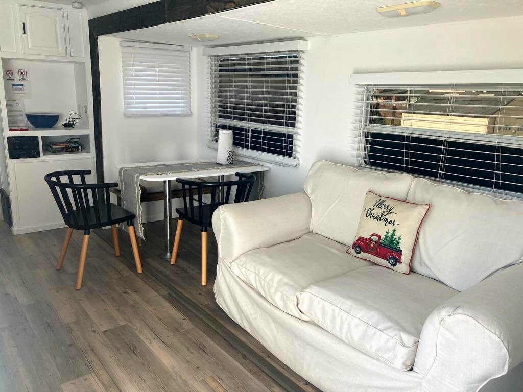 Venha desfrutar do nosso espaço de estar tranquilo e confortável que está escondido atrás das palmeiras e árvores frutíferas no canto de trás da nossa encantadora propriedade. A caravana foi redesenhada e remodelada para dar a sensação de uma casa encantadora. Equipado com o seu próprio Wi-Fi, cozinha, casa de banho, lareira e tv, terá tudo o que precisa para descansar confortavelmente! Oferecemos acesso à nossa banheira de hidromassagem, lareira e banho de gelo. Por favor, esteja ciente: temos alguns patos e dois cães amigáveis que gostam do quintal.