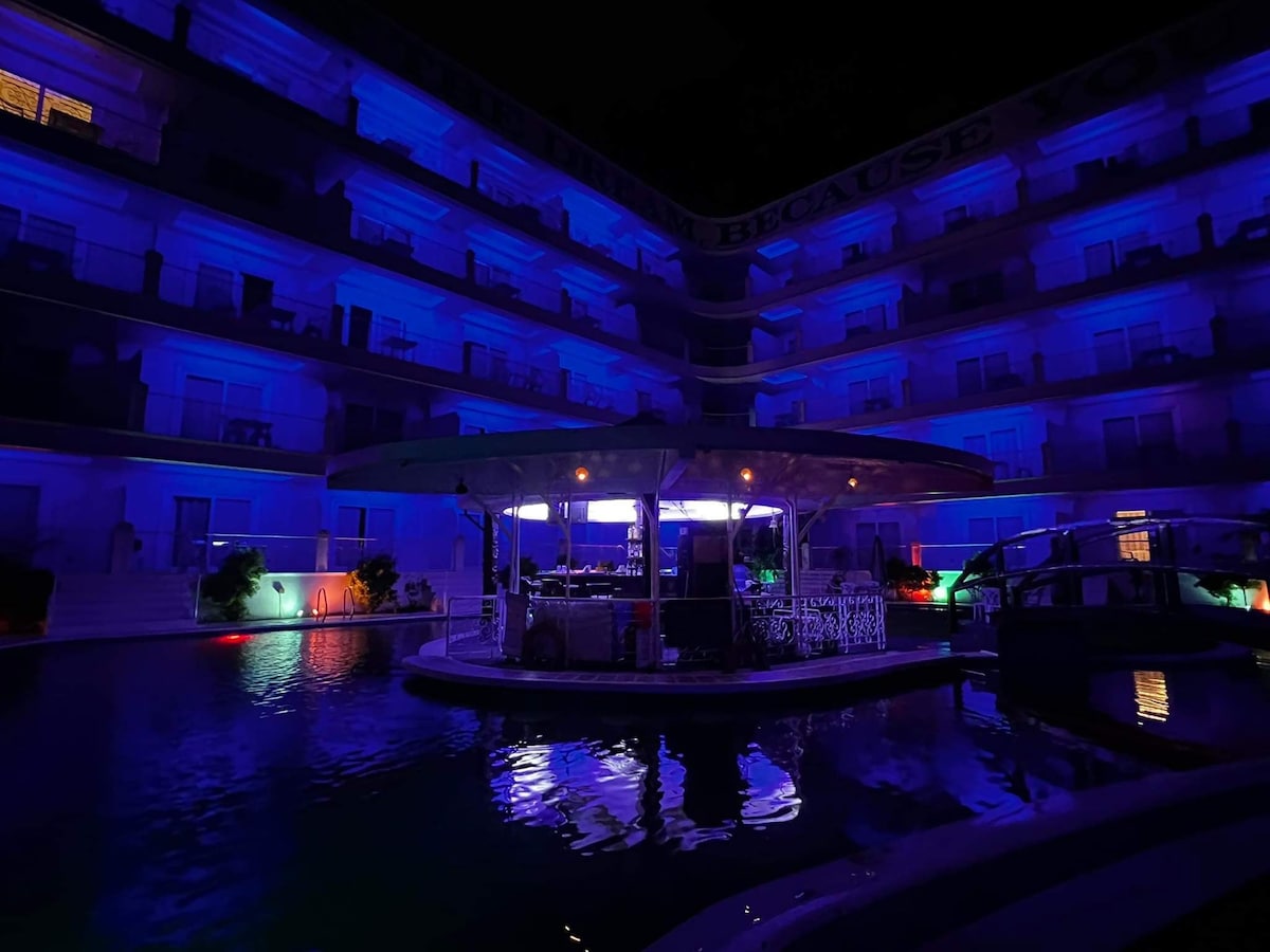 Desfrute de uma estadia relaxante nesta unidade grande, espaçosa e elegante de 1 quarto no Kandi Palace (8º andar). Utensílios de cozinha completos Televisão grande 2 atualizada Frigorífico Forno de micro-ondas Sofá grande Mesa de escritório e cadeira Mesa de jantar e cadeiras Mesa e cadeiras na varanda TV por cabo, streaming WI-FI RÁPIDO Luzes brancas e azuis Aquecedor de chuveiro Aquecedor de água Mobilado Integrado Integrado Área de estacionamento gratuita Acesso ao terraço: Piscina Restaurante Mais perto da ação, mas ainda tranquilo, perfeito para relaxar 🌸