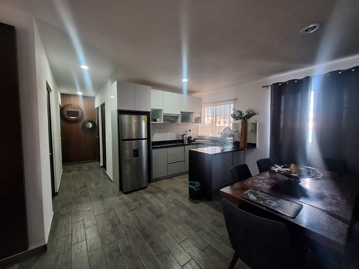 Criámos um espaço para a sua tranquilidade e conforto no sul de Aguascalientes. Localizado numa subdivisão com segurança 24 horas e excelentes comodidades. A apenas 18 minutos do centro da cidade. Espaço equipado com 2 mini aparelhos de ar condicionado, um no quarto principal com uma cama de casal e o outro no quarto júnior com uma cama king size.