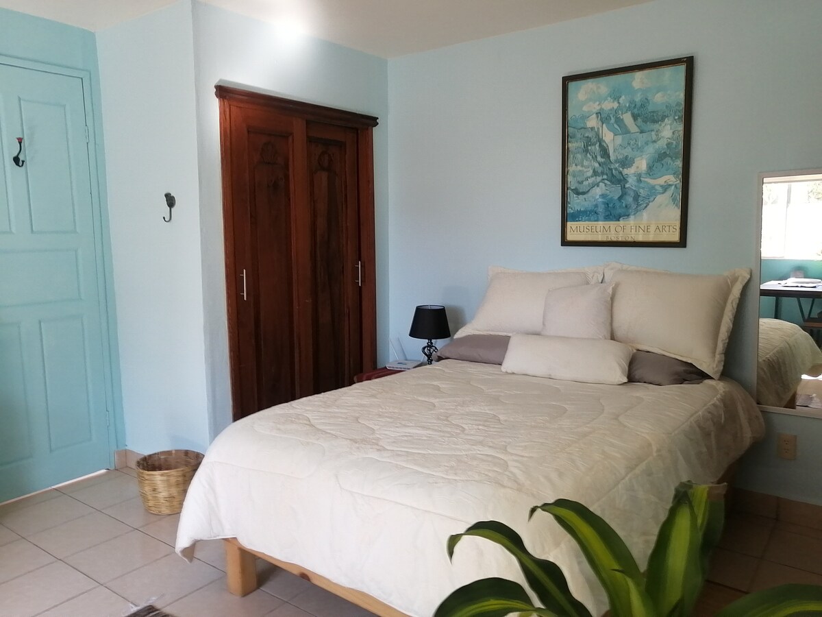 Viaje para San Cristóbal! Esta casa de família totalmente privada no vibrante bairro de Guadalupe espera por si, a apenas 15 minutos a pé do Central Park. Ideal para casais/nómadas digitais, oferece um quarto espaçoso (Queen), sofá-cama de casal, 2 casas de banho, cozinha equipada, varanda e terraço privado para desfrutar do sol e do clima de Sancris. Inclui uma máquina de lavar/secar roupa, Smart TV, secretária e Internet de alta velocidade. A sua base perfeita para experimentar a magia de Chiapas!