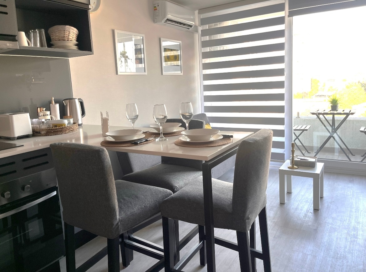 Apartamento acolhedor e luminoso com varanda, equipado com uma cama queen e um futon para um terceiro hóspede. Cozinha totalmente equipada Wi-Fi 500 Mbps Smart TV Depósito de bagagem gratuito Aceita animais de estimação A apenas 3 minutos do metro Departmental, supermercados, restaurantes e cafés a uma curta distância a pé. Autoestrada central a apenas 5 minutos de distância. Desfrute de um ginásio, áreas de churrasco e lavandaria self-service num edifício residencial seguro com concierge 24 horas por dia, 7 dias por semana. Ótima para casais e estadias longas. Reserve e experimente Santiago como se estivesse em casa!