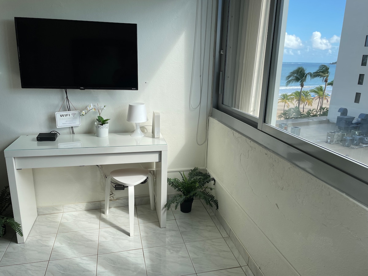 Faça uma escapadela a este estúdio de praia em Isla Verde. Desfrute de uma vista privilegiada para o mar a partir da sua varanda privada. Uma cozinha completa. Cama Queen confortável. Estacionamento gratuito. Supermercado e farmácia 24/7 a 5 minutos de distância. *NOTA: a piscina está fechada** Apenas a 6 minutos do aeroporto e a poucos passos da praia, a área segura e acessível a pé oferece restaurantes, vida noturna e muito mais. Ideal para casais ou viajantes individuais. Inclui receção 24 horas por dia, 7 dias por semana, ginásio, sala de jogos, etc.