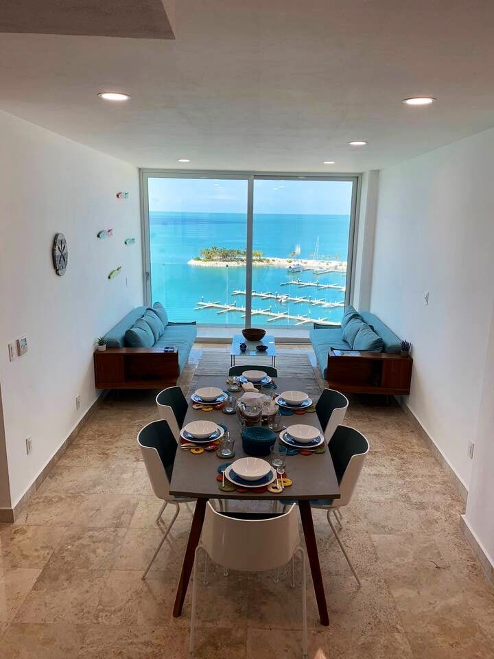 Aproveite sua estadia neste apartamento em estilo suíte, excepcionalmente localizado no 7º andar, com vista panorâmica da praia, da marina e do clube.Possui dois quartos, uma sala de estar, uma sala de jantar, uma cozinha totalmente equipada, uma lavanderia e um terraço frontal e lateral para aproveitar cada nascer ou pôr do sol.Inclui estacionamento privativo, segurança 24 horas por dia, 7 dias por semana e acesso a comodidades de hotel para uma experiência inesquecível. Reserve seu lugar.