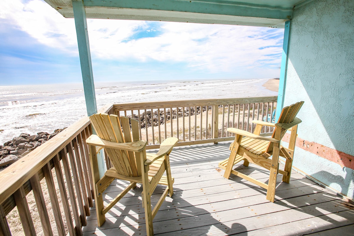 Dorme 11! Esta casa fica bem na praia ao lado da ponte San Luis Pass. A praia em frente à nossa casa é a melhor praia de conchas da região! Muito espaço, pois os vizinhos não estão perto. É uma curta distância até a praia de natação e rampa de barcos. A cozinha tem tudo de que você precisa para cozinhar ótimas refeições. Três banheiros completos, incluindo um no piso principal. Camas confortáveis. Vista fantástica para o mar! Churrasqueira a carvão no térreo com duas mesas de piquenique para refeições ao ar livre.