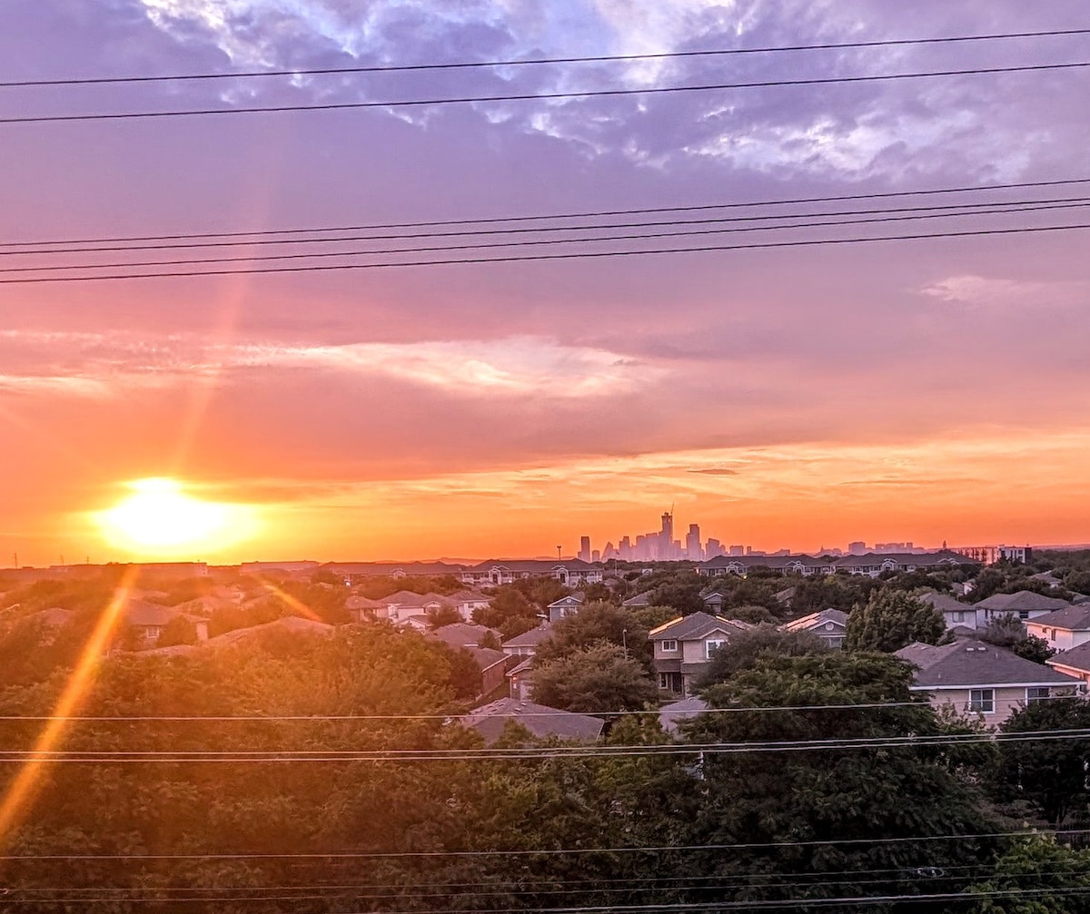 Retiro tranquilo e cheio de sol no sul de Austin. Apartamento no último andar (3.º, sem elevador) com vista para as árvores, entardeceres dourados e total privacidade. Concebido para uma reinicialização criativa, trabalho remoto ou uma escapadela pela cidade. Apresenta uma cama acolhedora, projetor para noites de cinema, banheira de imersão e espaço de trabalho integrado. Os hóspedes também desfrutam de acesso ao ginásio, piscina e churrasqueira ao ar livre. Ideal para estadias a solo, escapadelas de casais ou viagens de trabalho com um toque de serenidade.