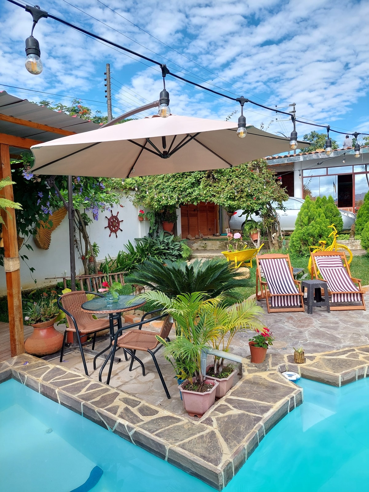CLUB HOUSE TARAPOTO, experiências inesquecíveis, o lugar perfeito para fugir da rotina, esta casa de jardim oferece espaços incríveis, piscina, jacuzzi, cascata, fogueira, caixa de areia, casa de crianças, pedestre e muito mais, a história continua dentro, com uma grande cozinha, sala de jantar e sala de estar, quartos com varanda, até 7 carros, apenas 4 minutos da praça Tarapoto. Com uma sensação de casa de campo, ideal para famílias ou grupos de amigos. Mínimo 4 pessoas e 2 noites. ALUGUE UM CARRO PARA 5 PESSOAS E TOURS PRIVADOS
