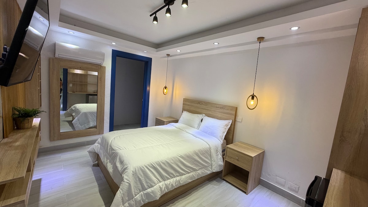Nuestra Habitación Frente a la Playa es amplia, luminosa y diseñada para el descanso total, con una hermosa vista directa a la Playa de Juan Dolio. Cuenta con cama cómoda, aire acondicionado, Smart TV, mobiliario moderno y ventanales que permiten disfrutar de la brisa marina y el entorno natural. Ideal para parejas o viajeros que buscan confort, tranquilidad y una experiencia única frente al mar.