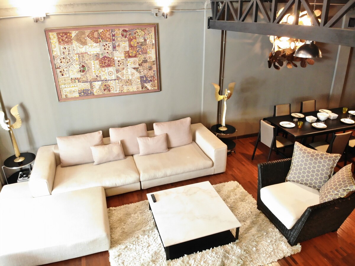 Suíte de Tamanho Familiar - pode acomodar até 8 pessoas. Fique em um aparthotel com 3 quartos e 3 banheiros e banheira com sala de estar espaçosa e cozinha de opção completa. O quarto é um loft industrial, com tijolos expostos e sofá de couro. Situado no Distrito Mercado de Waroroj da cidade de Chiang Mai, perto de tudo, ruas comidas, restaurantes, bares. A poucos passos do rio Ping, da cidade chinesa, do mercado de frutas. Aproveite o WI-FI extra de alta velocidade