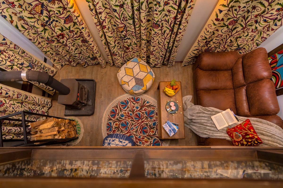 Welcome to our enchanting glass-roof tiny house nestled amidst trees, with nature as your constant companion. Immerse yourself in a unique glass stay, providing a breathtaking panorama of the surrounding hills. Equipped with a cozy wood burner, a well-appointed kitchen, a charming dining area, this retreat offers the perfect blend of modern comfort and the serenity of a treehouse hideaway. Experience a magical stay surrounded by nature's beauty in our one-of-a-kind Airbnb listing.