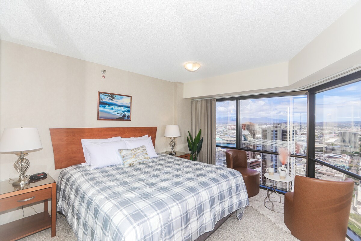 Desfrute de vistas deslumbrantes do pôr do sol, do oceano, da montanha e da cidade a partir deste espaçoso condomínio 1BR no piso alto com janelas do chão ao teto. Poupe $ 40 por noite com estacionamento gratuito seguro no edifício, Wi-Fi gratuito e cozinha totalmente equipada. Caminhe até aos melhores restaurantes e bares, à cidade da China e visite o histórico Palácio Iolani. O edifício tem excelentes comodidades, incluindo uma piscina e banheira de hidromassagem 7 dias por semana, segurança 24 horas. Starbucks/711/Paris Baguette/UPS no rés-do-chão para as suas necessidades diárias.