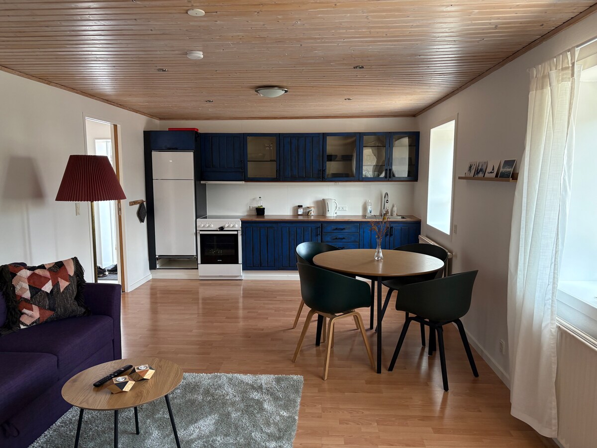 Small, bright and cosy apartment in a quiet neighbourhood in the heart of Torshavn with everything you need for a great stay. It is centrally located within walking distance from restaurants, cafés, shopping & cultural experiences. The apartment has a large private terrace, one bedroom, living room, a well-equipped kitchen, a large bathroom with heated floor, shower and washer. There is public parking right outside the front door, where you can park up to 8 hours for free.