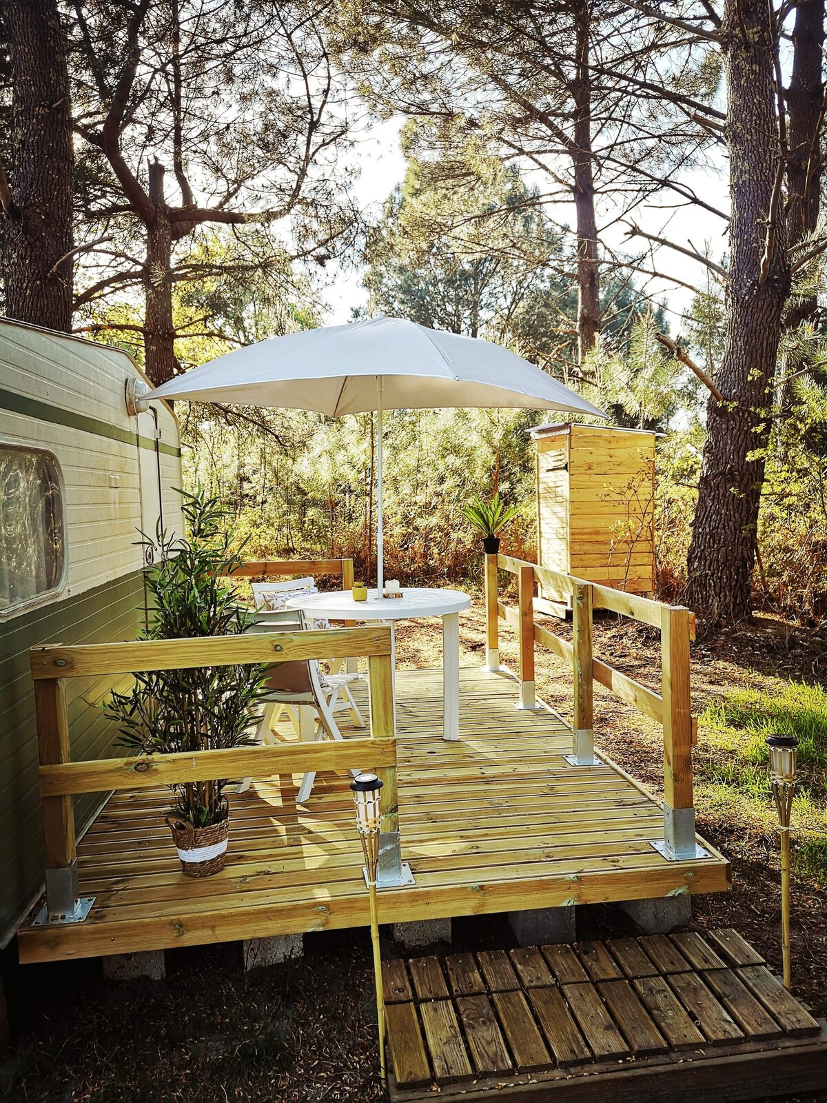 Alugue um trailer sob os pinheiros a 5 minutos da praia