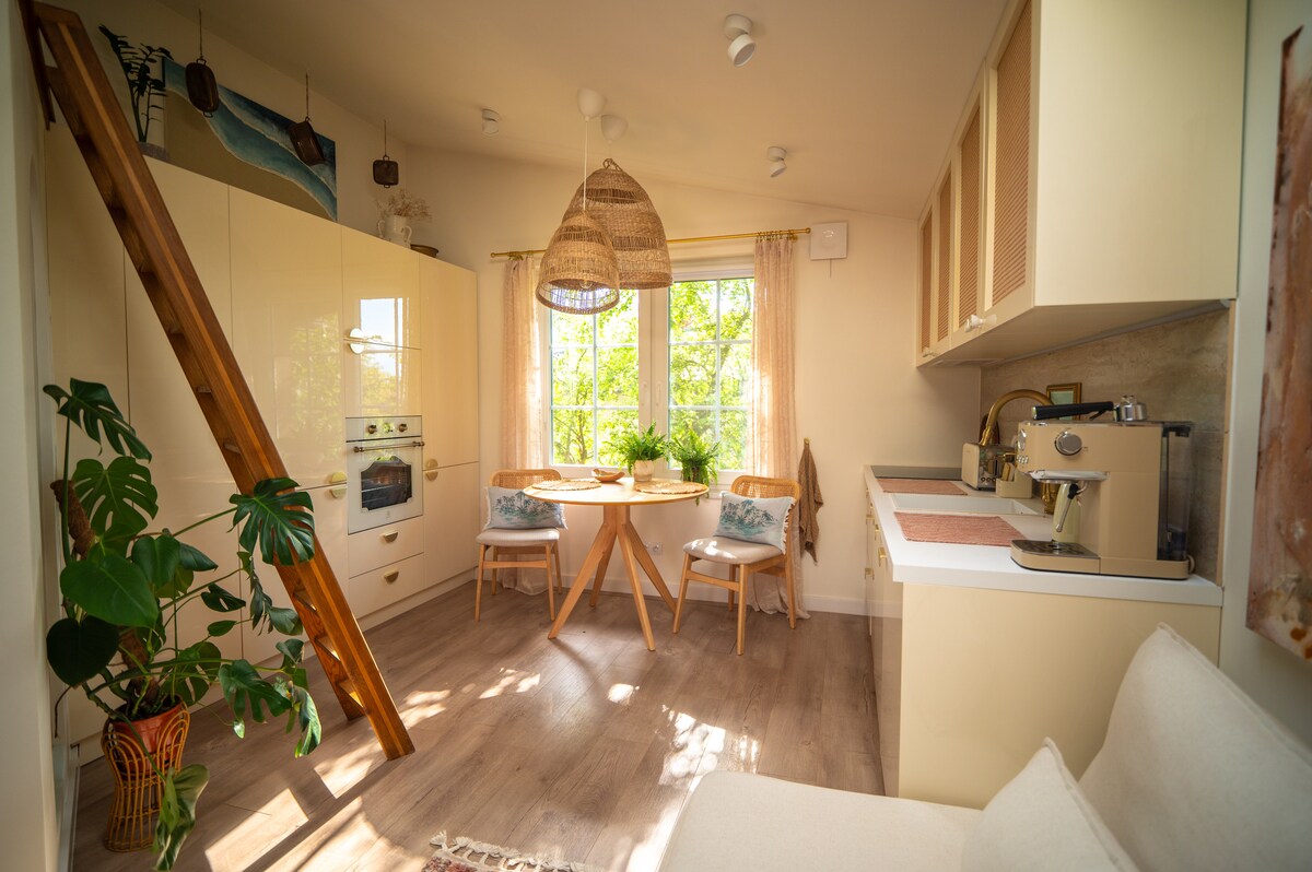 A casa de campo (twin) está equipada com uma sala de estar com uma kitchenette, um banheiro com um chuveiro e um quarto grande no primeiro andar. Todos os quartos estão totalmente equipados. A sala de estar tem um confortável sofá-cama e uma mesa dobrável com cadeiras. A cozinha tem uma chaleira elétrica, fogão de indução e o restante dos acessórios de cozinha necessários. O quarto tem duas camas de casal, uma mesa de cabeceira e um cabideiro. Além disso, a casa de campo tem uma TV e uma lareira elétrica.