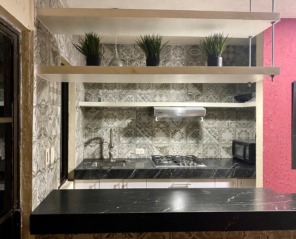 Piso Loft Lujo, 1 cama king e tapanco com outras 2 camas individuais. TV de 65" com Netflix e Disney + incluídos, cozinha completa com frigorífico, fogão elétrico, lavandaria e casa de banho completa. Vistas para a montanha Huasteca e para a mitra. Col. privado com vigilância, parque, oxxo e restaurante a 3 minutos a pé, 15 minutos do consulado americano de carro. Nós faturamos. Wi-Fi, água quente e tanque de água quente. 2 Climatização com ar condicionado e aquecimento. Não são permitidas festas, entrada de convidados e fumar.