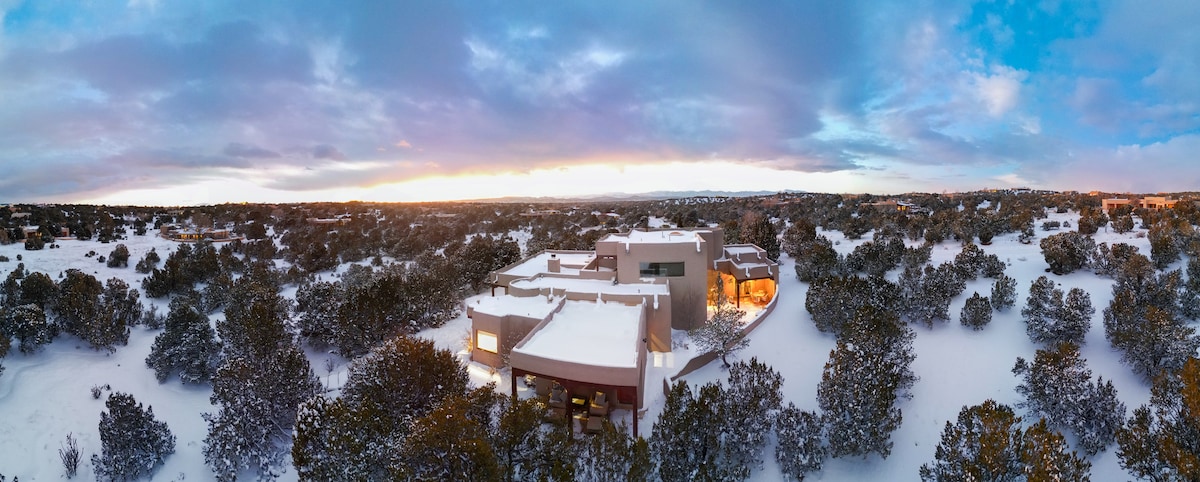 Este retiro de artistas de cinco andares, 4 quartos e 2 banheiros, foi recentemente renovado para combinar estilo pós-moderno, conforto fácil e charme tradicional. Desfrute de nasceres do sol espetaculares, pores do sol e observação de estrelas no 5º nível da casa enquanto desfruta do calor de uma grande lareira. Toques especiais de design incluem chuveiros revestidos de rochas do rio, detalhes de azulejos exclusivos e o calor de texturas e acabamentos de madeira em todos os lugares. A apenas 15 minutos da histórica Santa Fe Plaza, esta casa tem um belo pátio e muito estacionamento