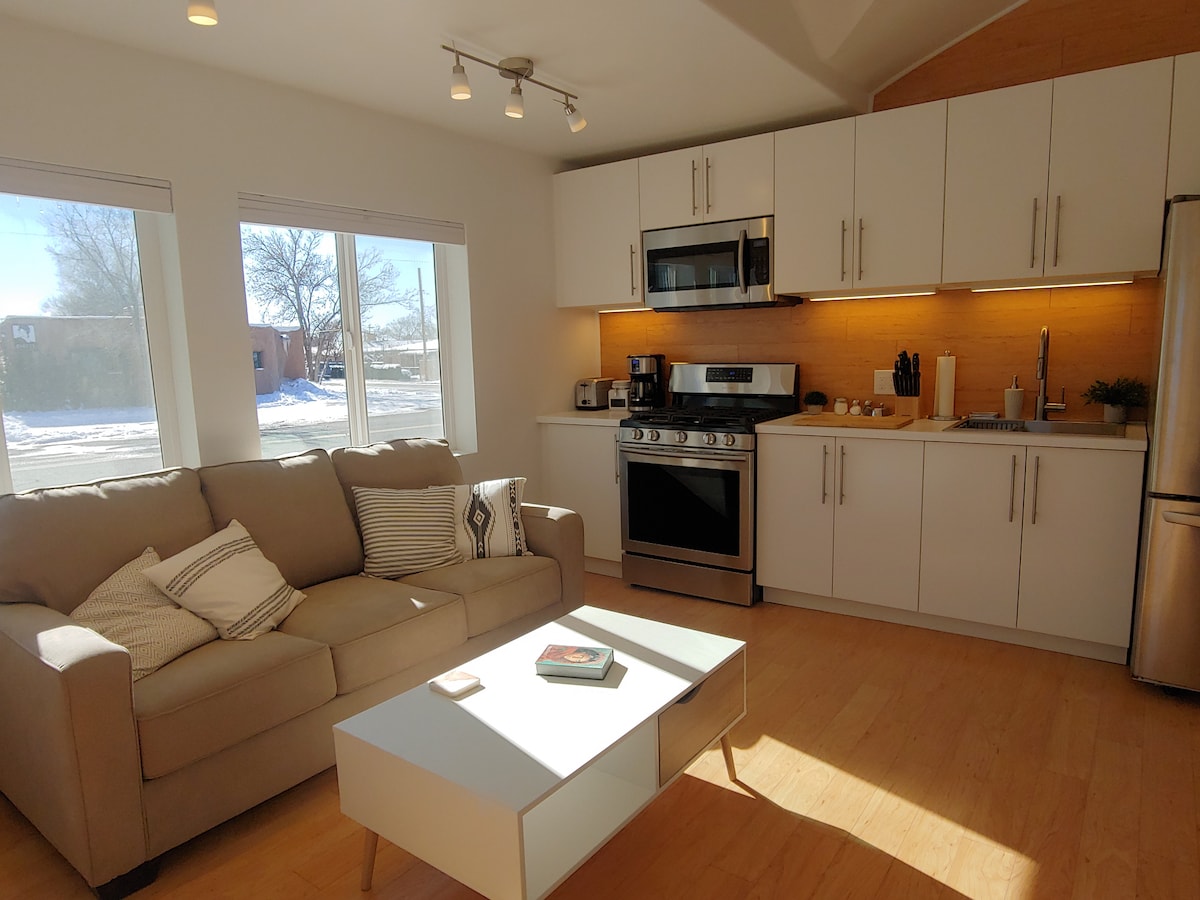 Casa pequena nova e independente (casita) com pátio privado pronto para a sua estadia em Santa Fé! Um bairro tranquilo do sudeste com vista para a montanha, estacionamento gratuito na rua, trilhos de bicicleta e a pé. Chuveiro de pedra fluvial, persianas de madeira antigas e um novo colchão Stearns e Foster king. Roupas de cama de luxo e produtos de higiene pessoal ecológicos. Novo frigorífico e congelador, microondas, chaleira e máquina de café com café Pinon do Novo México ou café normal, complementado com vidro e grés tradicionais.