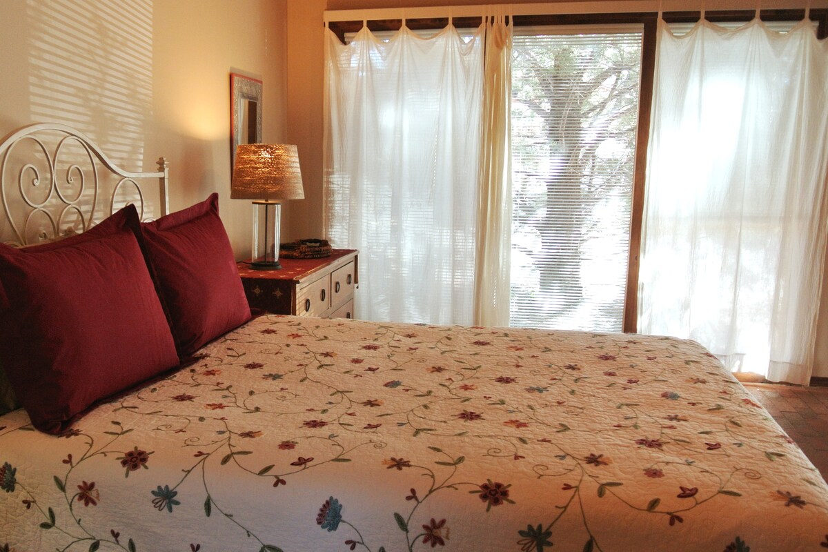 Você experimentará tudo o que Santa Fé tem a oferecer quando você ficar em nosso paraíso lindamente designado, a uma viagem panorâmica de oito minutos de carro da Praça Santa Fé. Recentemente remodelado, nosso retiro totalmente tranquilo e espaçoso de 900 pés quadrados está cheio de luz e natureza. Estamos a cinco minutos de Dez Mil Ondas e a 19 km de Ski Santa Fe. Perfeito para um retiro romântico ou uma família com dois filhos, é decorado com bom gosto com muitos toques especiais para uma estadia inesquecível.