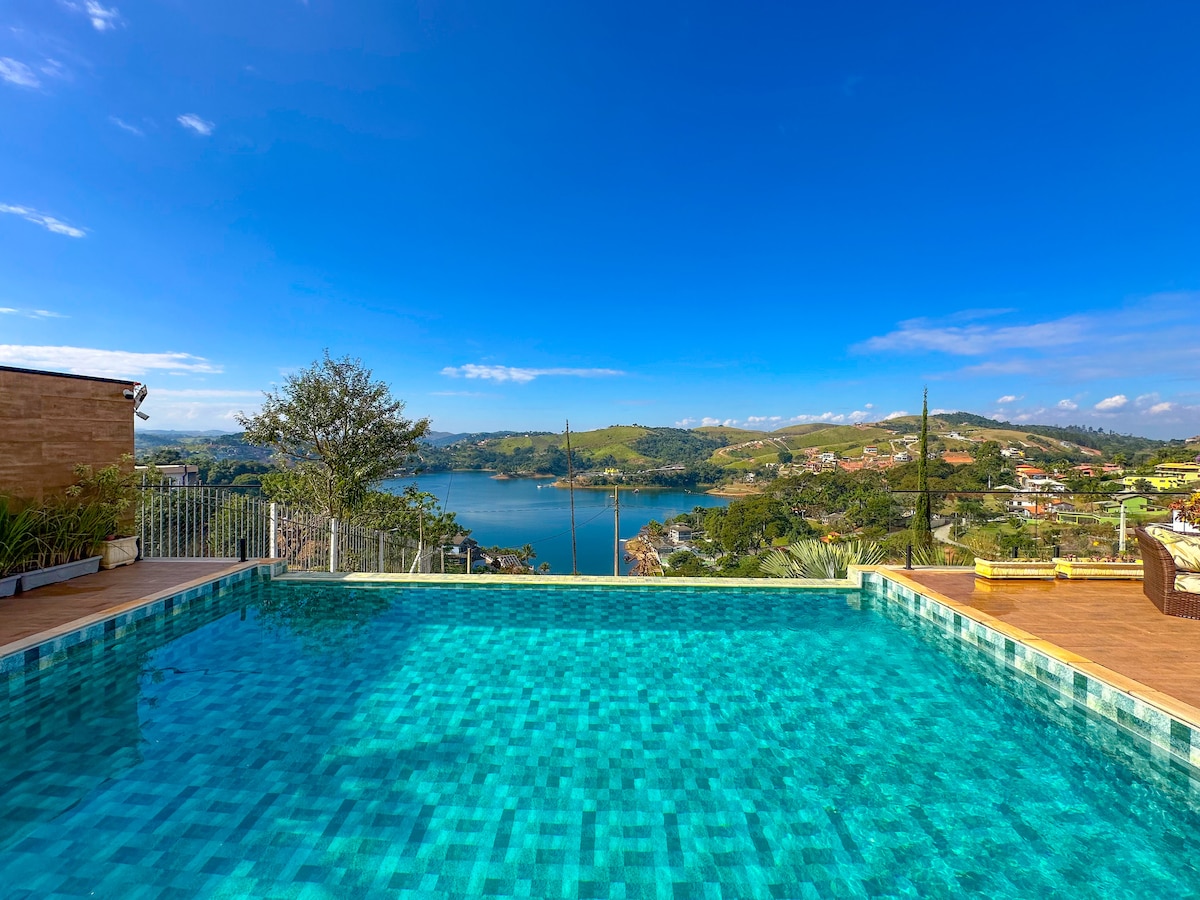 Vista espetacular para a represa, tranquilidade, segurança, lugar único com todo conforto. Ideal para relaxar e aproveitar momentos inesquecíveis com amigos e familiares em Igaratá a 1h de SP. Casa com 2 dormitórios para 8 pessoas, piscina borda infinita climatizada*, acesso privativo a represa com pier, churrasqueira, sala, sala de jantar, cozinha integrada, 3 WC, Wi-Fi 1 GB. Traga o seu jet-ski e desfrute da emoção de navegar pela represa rodeado por paisagens e a tranquilidade da natureza