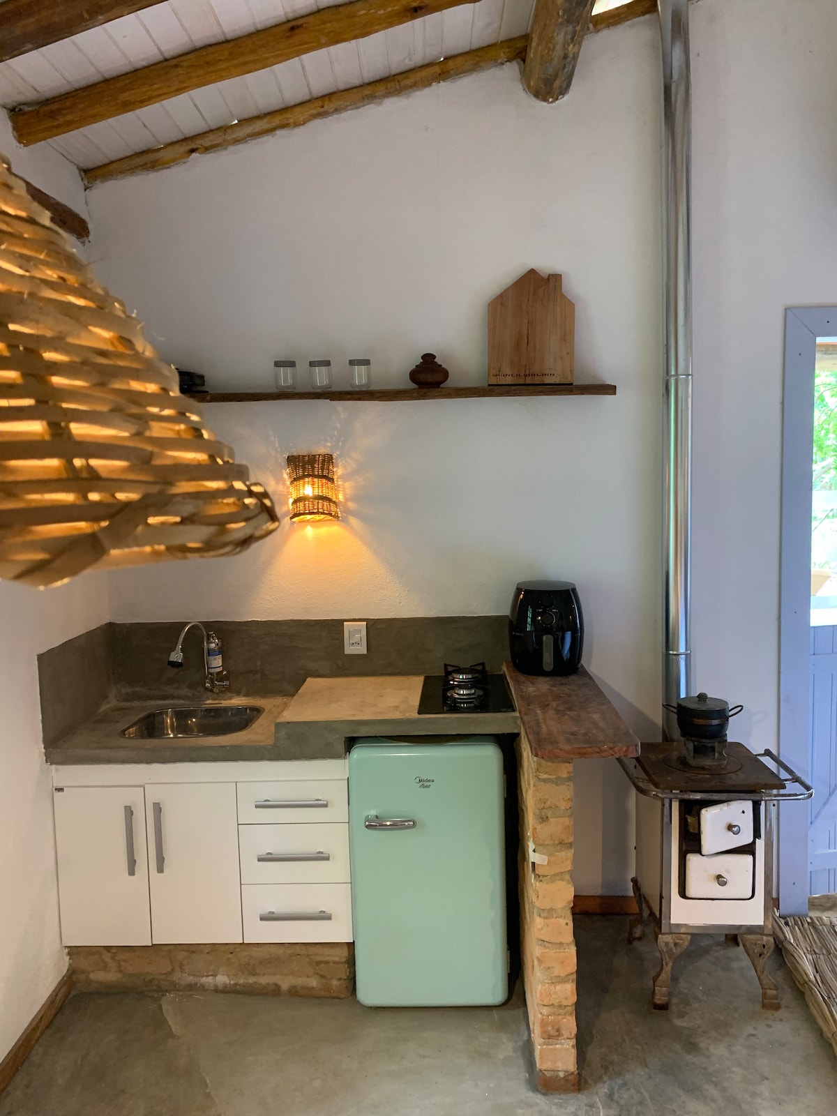 Linda casa de hóspedes com LAREIRA de frente para o VERDE, jardim e horta. Ambiente aberto sem paredes entre sala, quarto e cozinha, com uma varanda de frente para o melhor de Madalena: NATUREZA! Decoração aconchegante que te fará sentir super bem-vindo. Temos SAUNA! A 600 metros (10 minutos a pé) do Centro, no bairro Jardim Nova Madalena. Acomodações: 2 pessoas na cama de casal (queen) no espaço quarto, e 2 pessoas no sofá-cama super confortável no espaço sala. Não há parede entre os espaços!
