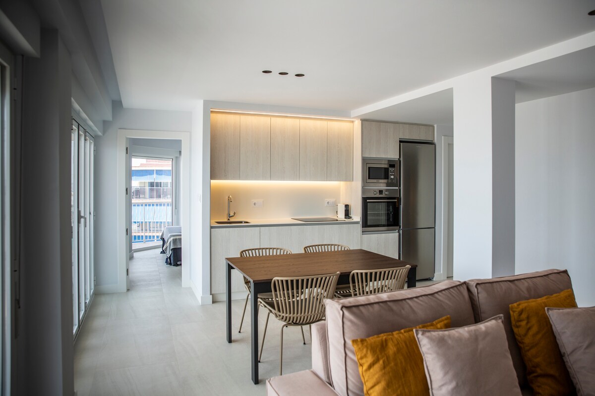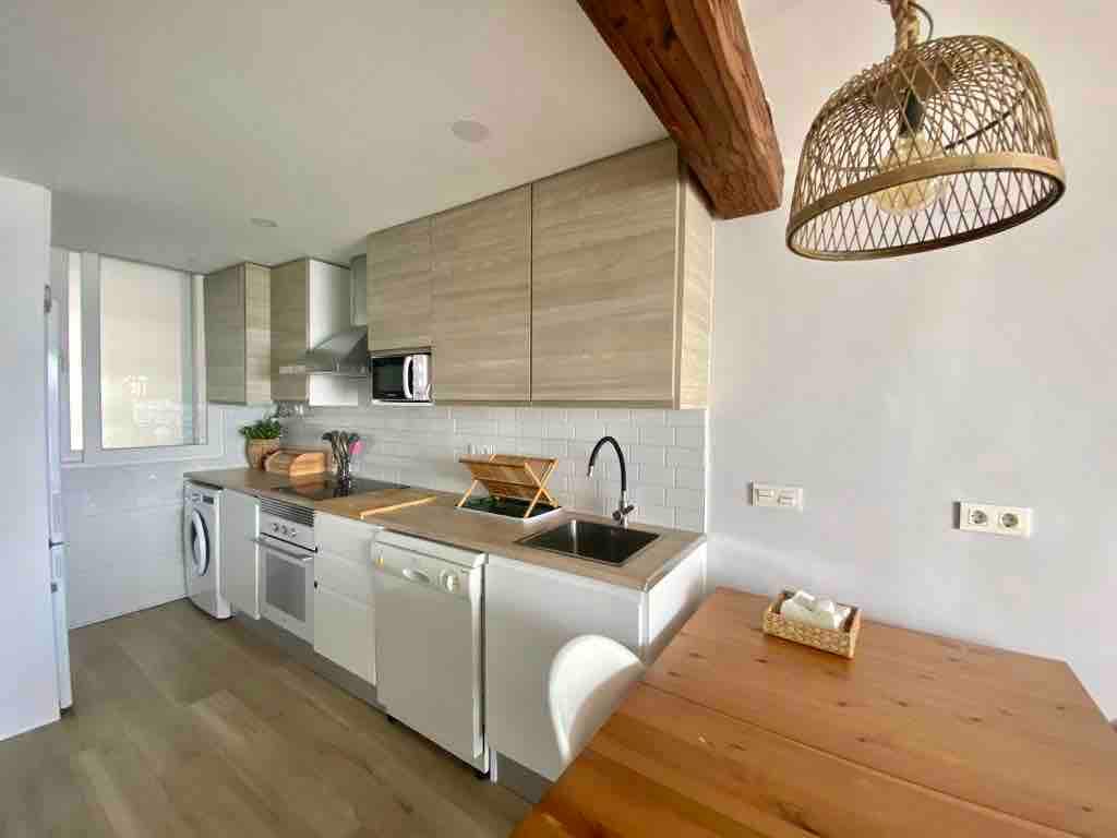 1 min a pé da praia. 100% reformado integral. Ar condicionado. Grande terraço com vista para o mar, elevador, todos os eletrodomésticos novos, todos os móveis novos. Wi-Fi de fibra 480MB, TV Samsung 55" (Smart TV, Netflix, Youtube, etc.), limpeza profissional, sala de estar com sofá-cama (muito confortável) 1,35, cozinha americana com ilha, quarto de casal cama 1,50 com saída para o terraço. Banheiro com chuveiro, máquina de lavar roupa, cafeteira, torradeira, micro-ondas... Todos os serviços a menos de 5 minutos