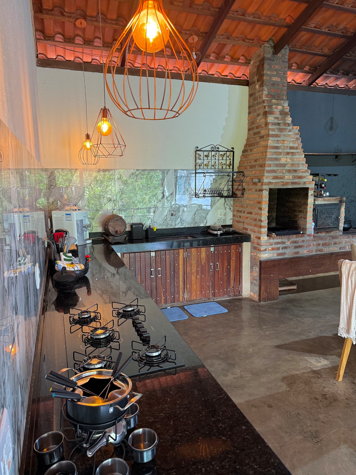 A casa é simples, rustica, tipo roça, com um riacho que passa ao lado e forma piscinas naturais de uso exclusivo dos hóspedes; Pode ser reservada por um casal, uma família, varios casais ou grupo amigos e familiares; a utilização da casa e da area de lazer é exclusivo do locatário Churrasqueira externa, cozinha com fogão à lenha e gás; 5 quartos, sendo 4 suítes com cama de casal e 1 quarto com beliches. O mobiliário é simples e banheiros básicos