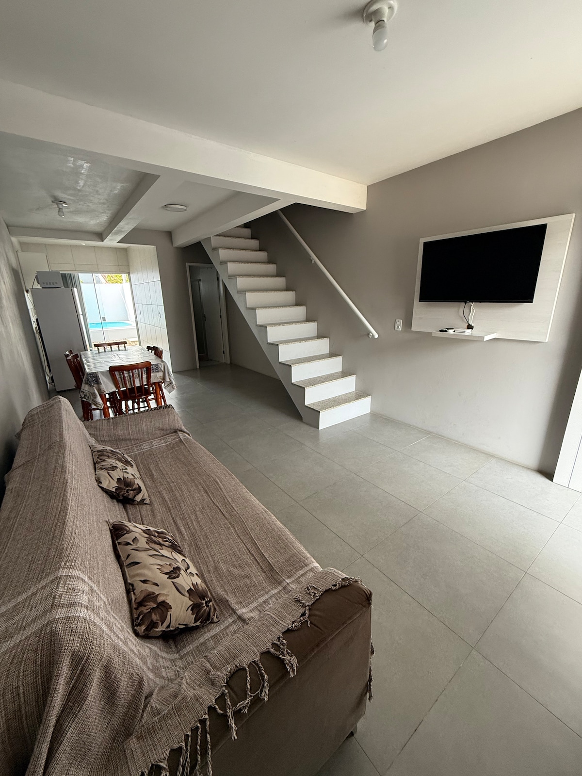 Casa de esquina, amplo espaço interno, dois quartos com ar condicionado(uma suíte) banheiro social com chuveiro, lareira, espaço da churrasqueira fechado, garagem, pátio, wi-fi, cozinha, tudo isso a uma quadra da praia.