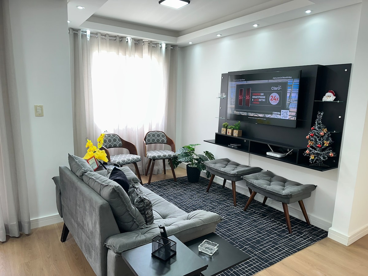 Apartamento com um quarto com cama queen, e sala com sofá cama para 1 adulto e uma criança, mesa e cadeira e TV Samsung 55", cozinha americana com frigobar, micro ondas, fogão, forno elétrico, cafeteira Keurig, panelas, formas metálicas e utensílios de cozinha. Para sua comodidade e conforto Lavadora e secadora de roupas LG. Secador de cabelo e prancha Revlon. Na cobertura piscina, sauna seca, ducha e lounge com mesa de bilhar. Estacionamento com manobrista. Serviço de Hotelaria diariamente.