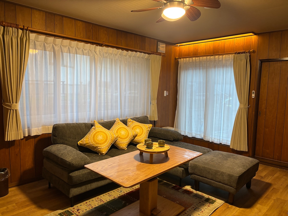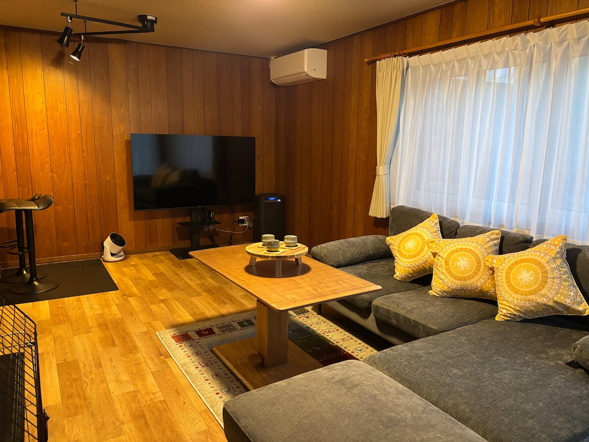 Inclui 5 quartos e uma grande área de estar. Elegante e funcional Muito espaço de arrumação garante uma estadia sem confusão, mesmo para grupos grandes. Espaços sociais e privados Reúna-se em áreas partilhadas ou relaxe no seu próprio quarto. Ecrã de 120 polegadas Desfrute de filmes com um projetor. Supermercado nas proximidades. Perfeito para famílias ou grupos! Churrasco e sauna privada. [Conjunto de opções: 24 000 ¥] *Há apenas um ar condicionado na sala de estar. (Existem várias ventoinhas elétricas.) O aquecimento é fornecido em cada quarto.