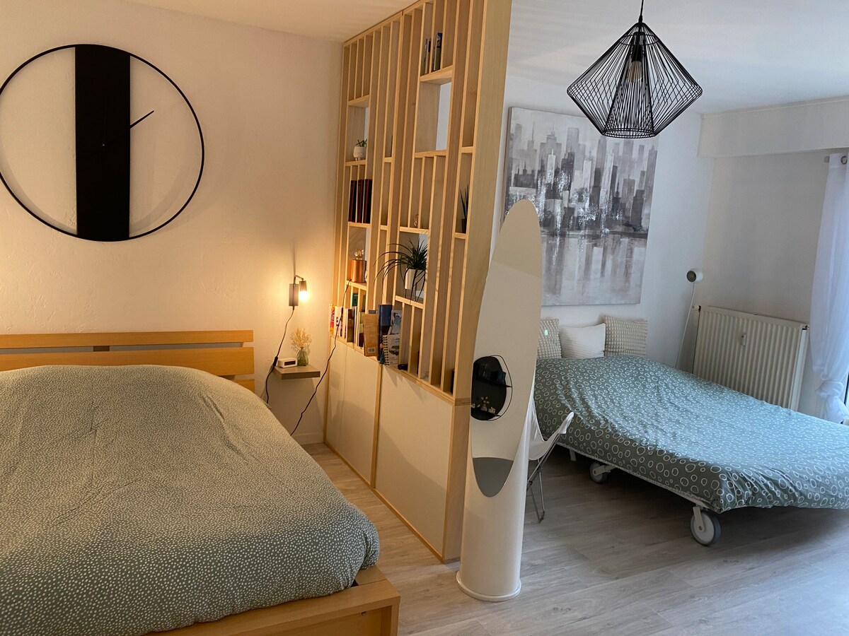 Grande estúdio de 32m2 com grande terraço perto do centro da cidade e estação ferroviária em residência segura e tranquila. Remodelado, totalmente equipado com Wi-Fi. Cama de casal de 140 cm e possibilidade de 2ª cama de 160 cm (sofá) ideal para famílias ou profissionais. Perto de lojas e estacionamento gratuito na rua disponível Ao pé do elétrico e da linha de autocarro. Check-in autónomo com fechadura inteligente. Disponíveis: Lençóis (cama feita), toalha de banho, produtos de chuveiro e louça, lavandaria, chá, café, açúcar, óleo e vinagre