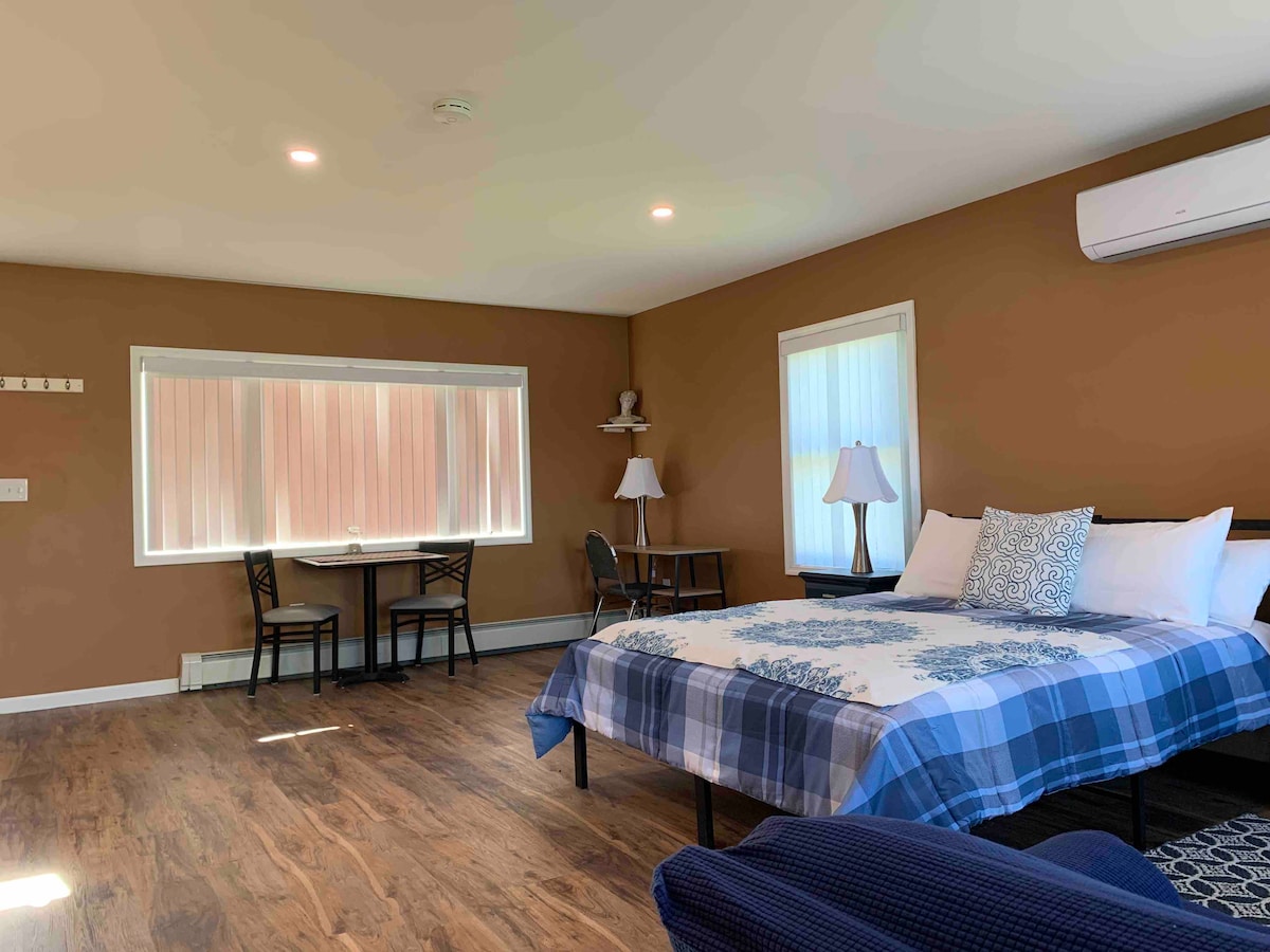 Large 1 bedroom apartment with 10 foot ceilings, located in Kingston Historic Rondout District. Queen size bed and one large futon conversation, there are large pocket doors that separate the bedroom from the living room, pool table, lots of natural light, blackout curtains , air conditioning, claw foot tub, small private patio, 60 inch wall tv, walk to the historic Rondout water front, restaurants, boat rides, trolly, art galleries, Kingston Point Beach and Hudson Brickyards.