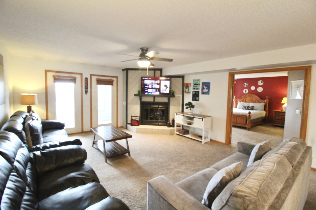 Condomínio de um quarto à beira do rio em uma área tranquila do centro de Wisconsin Dells. Dê um passeio perto do belo River Walk e desfrute da paisagem magnífica e das atrações únicas do centro de Wisconsin Dells. Se você precisa de alguns dias para relaxar e descomprimir ou se você está na cidade a negócios ou jogos, nosso apartamento oferece uma cozinha totalmente equipada, uma cama king size e um sofá-cama queen size. Há uma piscina comunitária coberta, banheira de hidromassagem e sauna. Há também uma piscina externa sazonal.
