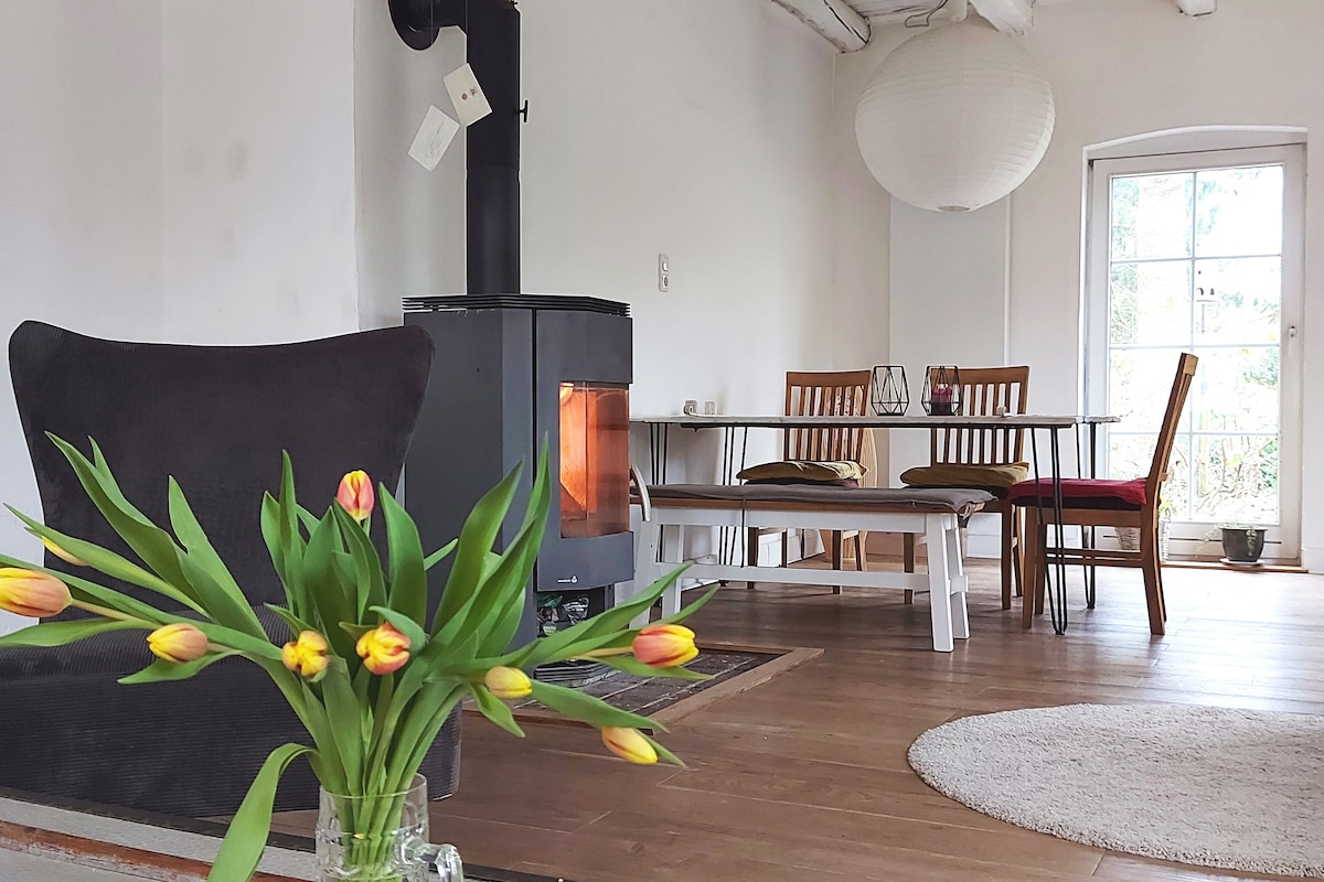 Relaxe em uma moderna casa de madeira mobiliada à beira-mar no Mar Báltico. Depois de passear na praia, você pode tomar um banho na ducha do jardim protegido do vento e depois relaxar na banheira de água quente, ouvir as gaivotas, talvez ir à sauna novamente antes de se retirar para relaxar no lounge da varanda ou na loggia protegida. Você pode terminar o dia com uma bebida perto da lareira e aproveitar a grande sala de jantar com seus entes queridos. Bem-vindo ao Ole Käthe.