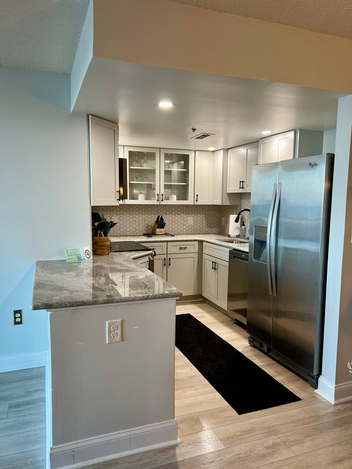 Steps to the beach! Fully renovated, bright, modern, clean condo with a balcony view of the ocean. Quiet North Ocean City location with walking distance to restaurants, bus, 7-11, Mini golf course, movie theater, parks, etc. Brand new appliances and furniture. Free WiFi, King Size Bed, 60" & 40" TVs. Pull Out Queen Sofa, Brand New Full Bathroom. Washer and Dryer in the unit. Keurig Coffee Station, iPhone Charging station. Private balcony. Free Parking Space.