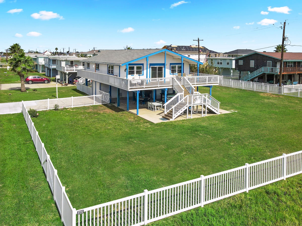 Relax and have fun with the whole family at this peaceful 2-bed 1-bath beach house. The big fully fenced-in yard provides a safe location for kids to play as well as a place for small dogs. It also has a fire pit to enjoy with your family. The home sleeps six people comfortably and includes a big size upper deck with seating perfect to watch the beautiful sunrise or have your preferred drink while hearing the waves at evening. Just 15 min. from all the Galveston Attractions