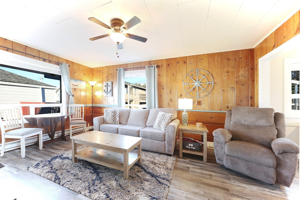 Sandcastle Unit B-4 - o refúgio perfeito para casais e famílias. A 1,5 quarteirões da praia, este apartamento remodelado, no primeiro andar, com 2 camas e 2 casas de banho em South Cannon Beach é um local tranquilo e relaxante a 2 milhas do centro da cidade. Inclui uma garagem para 1 carro equipada com um carregador universal de alta velocidade EV GRATUITO e uma piscina aquecida de água salgada (comunitária). Fica ao lado do Fresh Foods Market e tem muitas comodidades para crianças. Novo colchão king size de firmeza média com um sobrecolchão macio e um novo sofá premium de couro