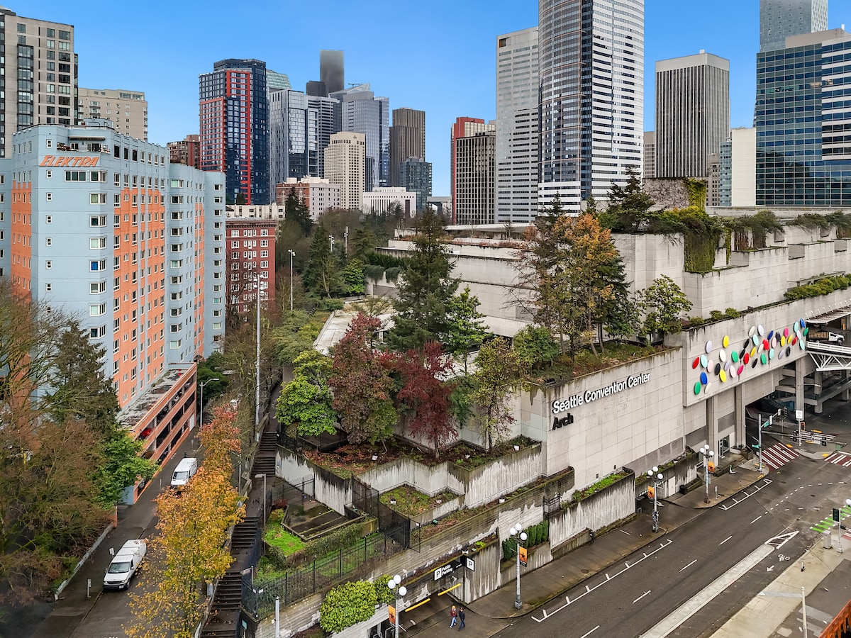 Localização, localização, localização! Vida urbana com vista para o terraço no centro de Seattle Vivemos no local e gerimos todo o edifício. Sempre disponível. Experimente o melhor do centro de Seattle a partir deste apartamento elegante com vistas deslumbrantes da cidade e um terraço espetacular no último piso. Caminhe até ao Pike Place Market, Post Alley, Waterfront, Space Needle e inúmeros restaurantes, bares, lojas e galerias mesmo à sua porta. Totalmente abastecido e cuidadosamente concebido, o seu refúgio perfeito no centro da cidade está à sua espera!