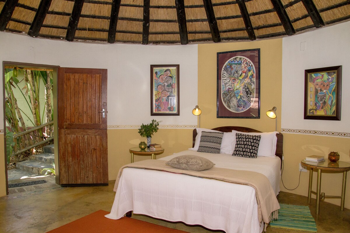 Esta é a paragem perfeita a caminho do Parque Nacional Kruger, de Moçambique ou da Suazilândia. Situado a 250 km do aeroporto OR Tambo, a 100 km dos portões de Malelane e Numbi. O preço inclui alojamento para 2 hóspedes, pequeno-almoço e jantar a pedido. Uma "cabana" redonda tradicional com um telhado de palha. Cama queen extra. Casa de banho privativa e casa de banho privativa e chuveiro. Área de estar exterior privada.