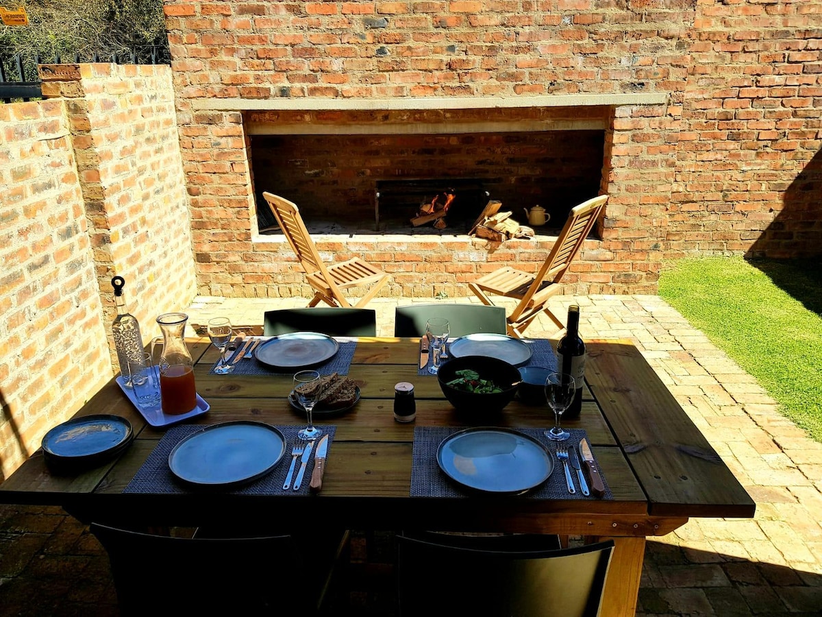 Casa de campo deslumbrante com uma cama queen, casa de banho privativa com chuveiro, área de estar e cozinha totalmente equipada. Esta unidade é composta por dois andares e tem escadas. Adorável pátio com área de estar exterior e instalações privadas de braai.