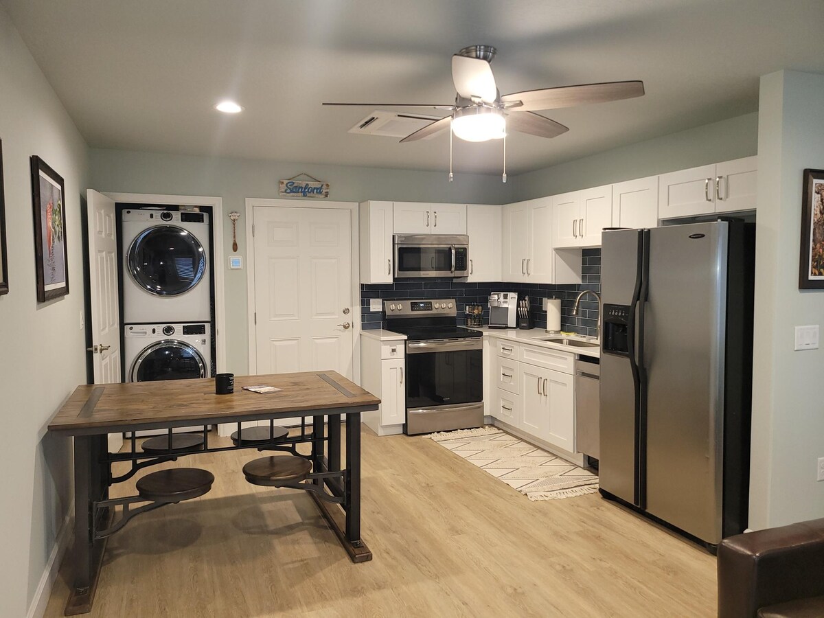 Venha conhecer esta luxuosa casa de hóspedes dos anos 50 recentemente renovada com uma altura de teto espetacular e uma cozinha única e um pátio privado cercado. Localizada numa área de carrinhos de golfe perto do centro de Sanford. Apenas a 8 minutos do Aeroporto de Sanford, a aproximadamente 30 minutos de New Smyrna Beach, a 40 minutos do Aeroporto Internacional de Orlando, de todos os principais parques e de Daytona Speedway. Estacione as suas bicicletas na brisa coberta para se proteger contra a chuva e o sol. Estacionamento disponível na rua e fora da rua.