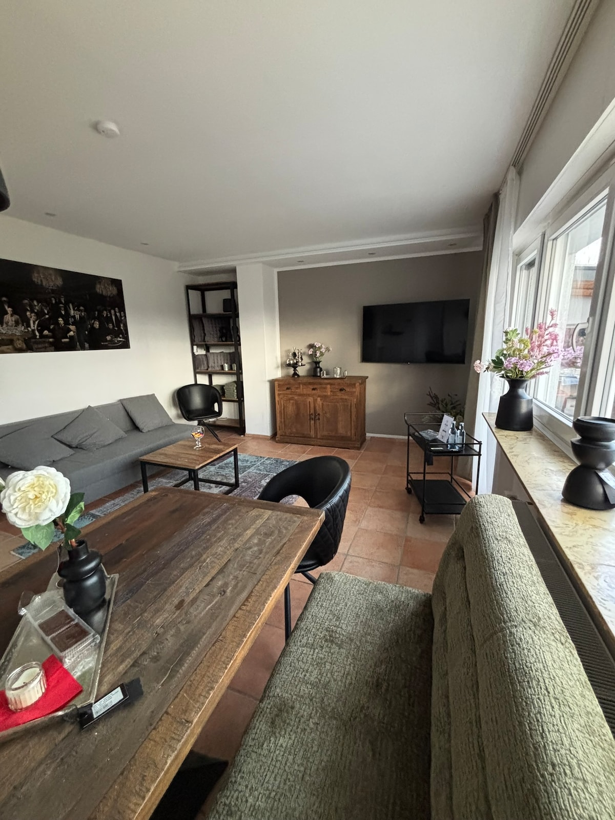 Recentemente renovado, elegantemente mobilado e totalmente equipado: apartamento perfeito para se sentir bem! Com varanda, cama box spring, duas smart TVs, Wi-Fi e cozinha moderna incl. Máquina de café automática. Café em grão, especiarias e muito mais incluídos! Estacionamento público diretamente na rua. Wallbox para carregamento de carros elétricos disponível. Ideal para casais, viajantes de negócios e visitas a feiras em Colónia ou Düsseldorf.