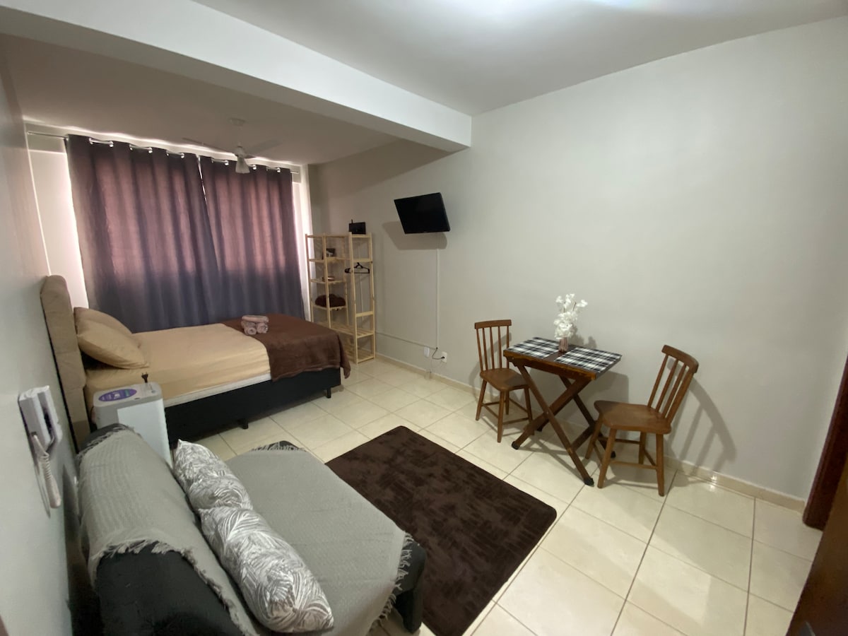 Apto tipo estudio com os ambientes separados. Um quarto com armário embutido e mesa para home office, 2 TVs (sala e quarto), Net Combo com mais de 200 canais HD e Wi-Fi de alta velocidade. Há ventiladores de piso em todos os ambientes além de microondas, airfryer, fogão, geladeira duplex e todos os utensílios de cozinha. O banheiro é privativo com box de vidro. Possui máquina de lavar roupa. Meu apto não possui vaga de garagem, porém, indico uma moradora que costuma locar dentro do prédio