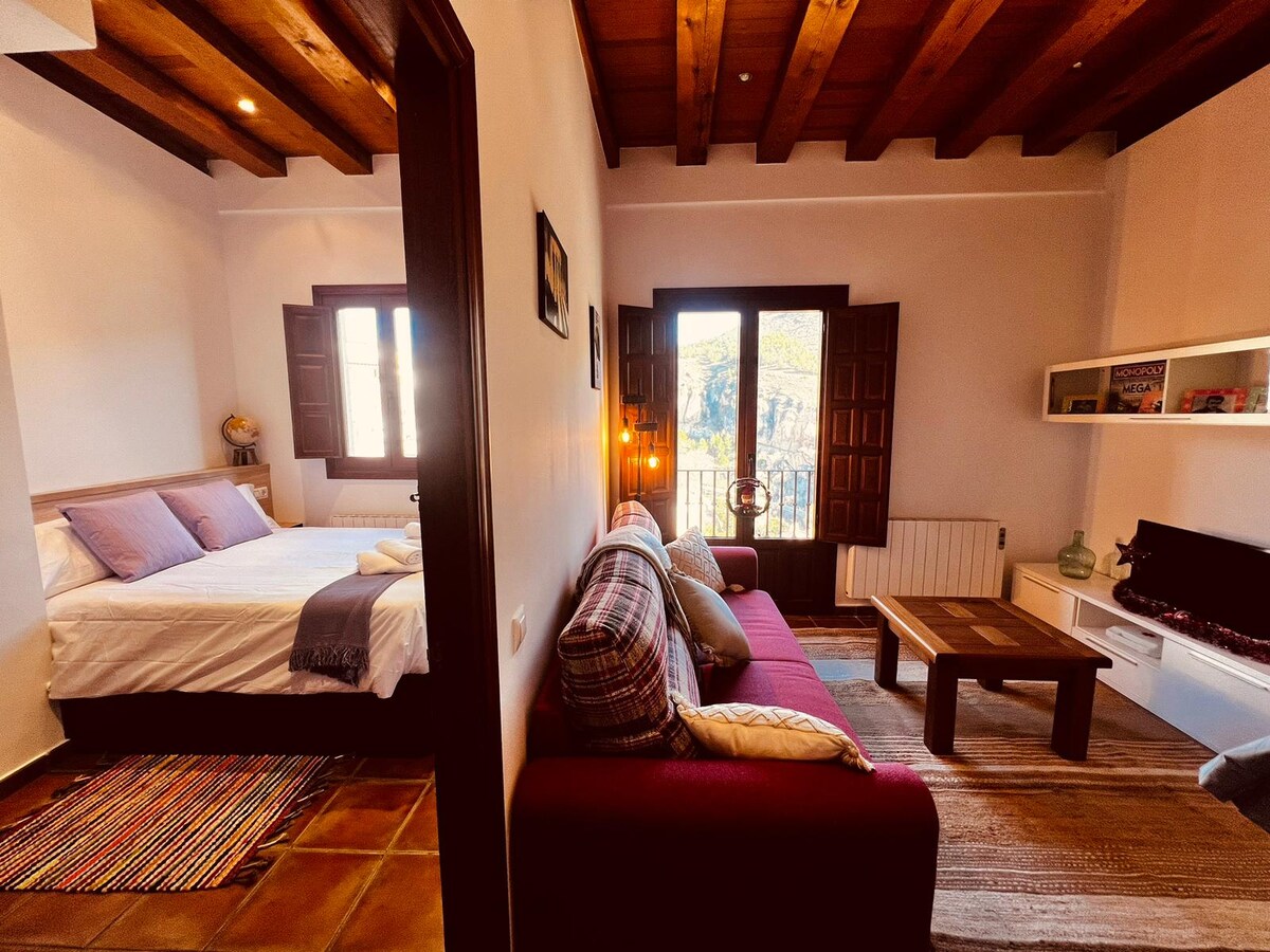 Esta impressionante acomodação de 94 m2 e teto de vigas expostas Tem uma grande sala de estar e cozinha totalmente equipada. Tem dois quartos, um deles com cama de casal e banheiro privativo e vista para a Hoz del Huécar; e o outro é um quarto muito espaçoso com duas camas de solteiro de 90 cm. Além disso, o alojamento tem um segundo banheiro completo para maior privacidade dos nossos hóspedes.